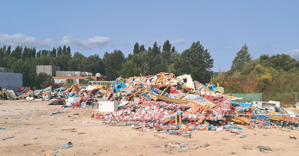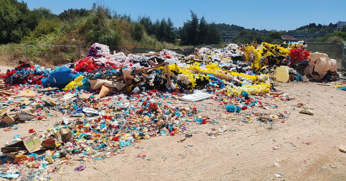 Os resíduos dos carros alegóricos continuam abandonados num terreno junto ao UC Exploratório – Centro Ciência Viva de Coimbra.